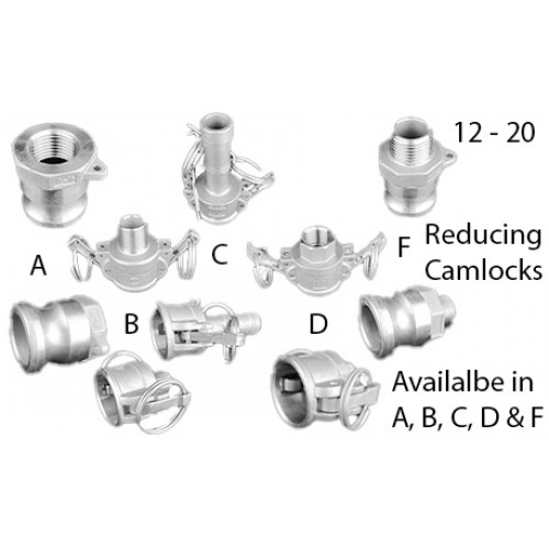 Our Stainless Steel 20-12 Camlocks are available in type A, B , C, D and F camlocks in 20mm (1/2") to 12mm (3/4").